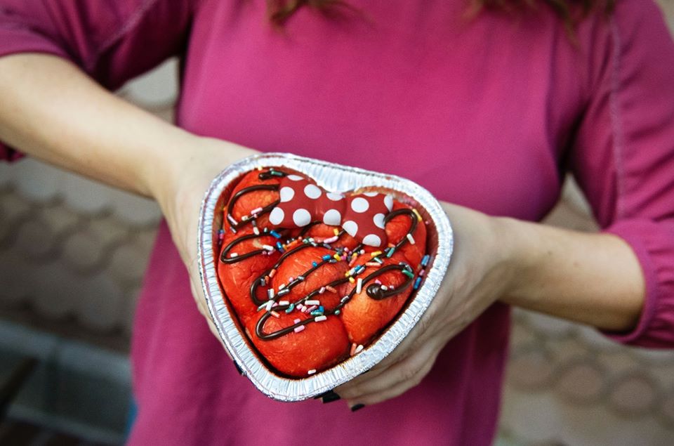 - Sweetheart Bread (Available at Amorette’s in Disney Springs) – House-made rolls colored red and sweetened with cinnamon and chocolate sauce topped with a chocolate Minnie bow