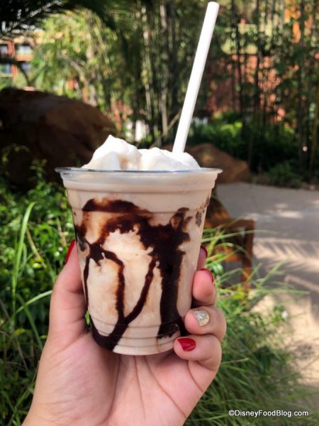 We’re back underneath the thatched roof that covers Uzima Springs Pool Bar to try another one of the new cocktails exclusive to this location! Because even though it’s still winter, temps are heading into the high 80s here in Orlando this week. So what better time to try the new frozen Safari Mudslide?