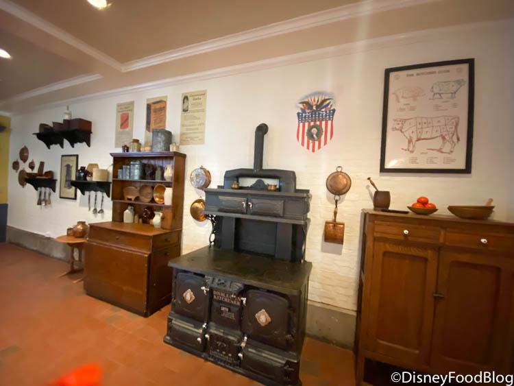 The colonial, early-American style furnishings are carried throughout the space. You’ll see lots of cast iron, pewter, and copper cookware lining shelves and hanging from the walls! Check out this cool old-timey-looking cast iron range! It must weigh a ton — which is about how much we’ll weigh when we’re done chowing down! 😉