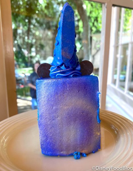 At the end of your meal, you can indulge yourself with the Magic Happens Bundt Cake that would make Sorcerer Mickey proud! The drizzle on top was a sweet icing paired with whipped cream, chocolate ears, and a candy-covered sorcerer’s hat.