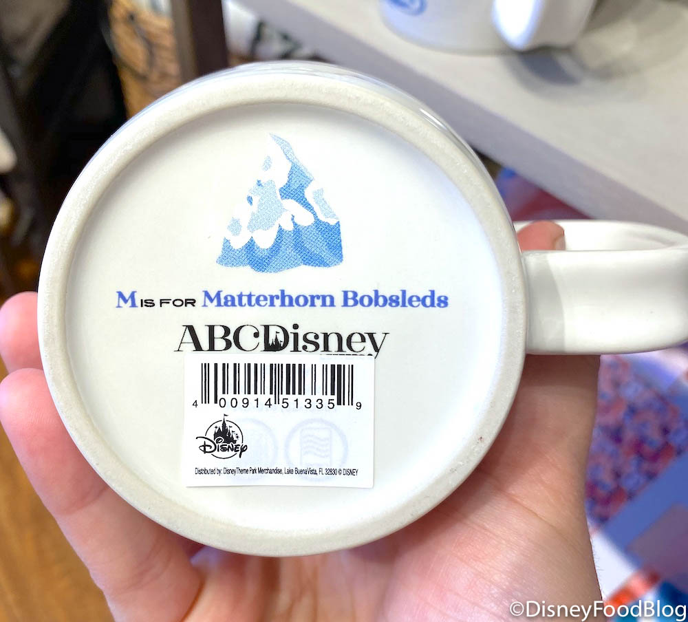 While both parks have Main Street, U.S.A. with horse-drawn carriages like the M Mug in Disney World depicts, Disneyland also has the Matterhorn Bobsleds for guests to escape the Abominable Snowman.
