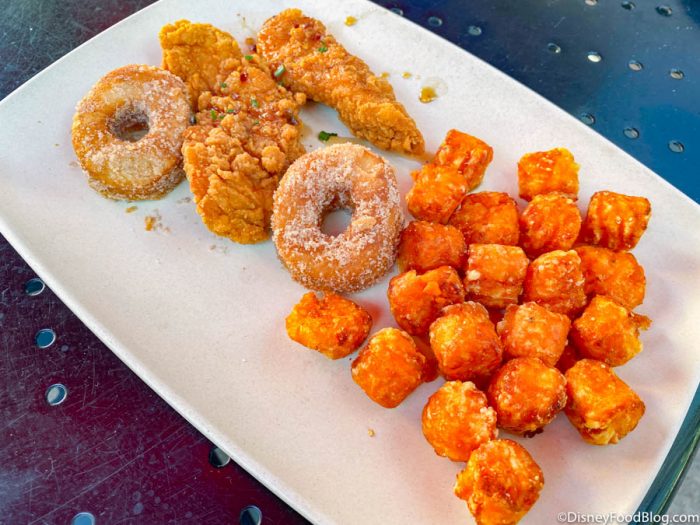 The chicken tenders were crunchy, flavorful, and had a slight spiciness to them (and we would have even been game for more heat!). The kick of flavor from the savory chicken balances out the sweetness from the maple syrup, donut, and sweet potato.