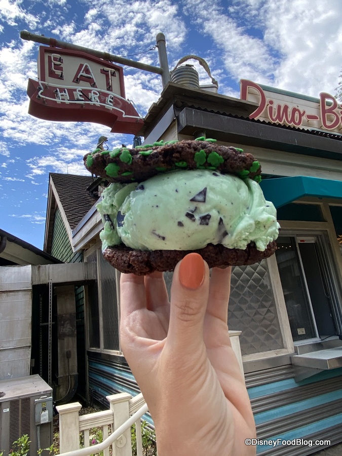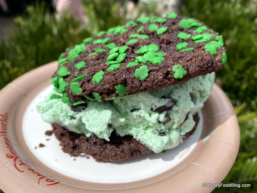 And in Disney’s Animal Kingdom, Dino-Bite Snacks in Dinoland, U.S.A. is where you’ll find a new addition to the St. Paddy’s Day snacking lineup with the Mint-Chocolate Chip Ice Cream Sandwich!