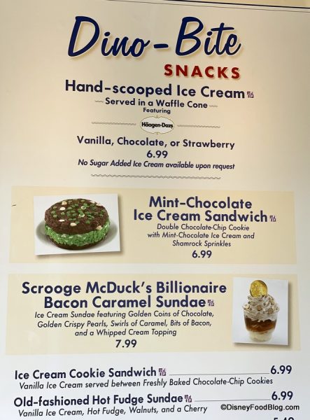 It joins Scrooge McDuck’s Billionaire Bacon Caramel Sundae as the other highlighted specialty item on the menu. (Yep, Dino-Bite Snacks is at it again since the Chocolate Strawberry Ice Cream Sandwich has made its departure after Valentine’s Day.)