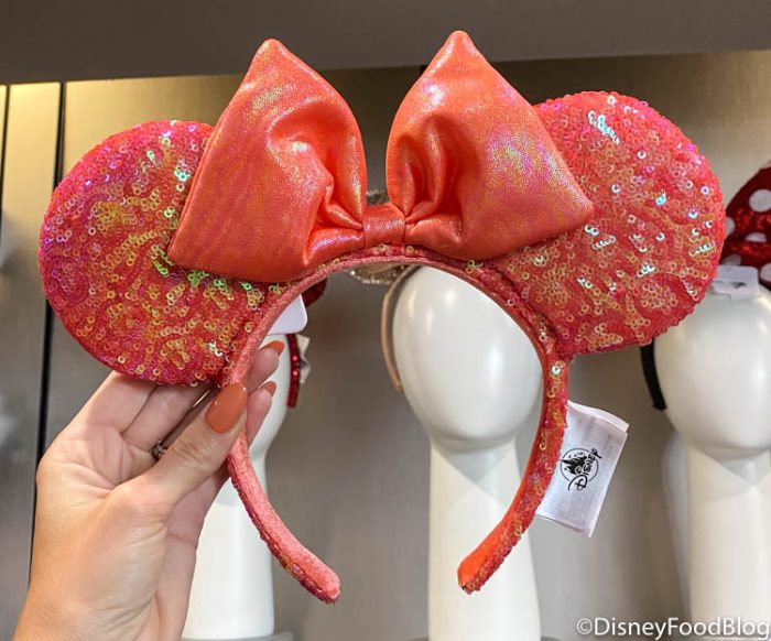 The Coral Minnie Ears are encrusted with pinkish-orange sequins which have a subtle iridescence to them — annnnd they’re GORGEOUS! The bow that completes them is also made with a shiny material that shimmers in the light!