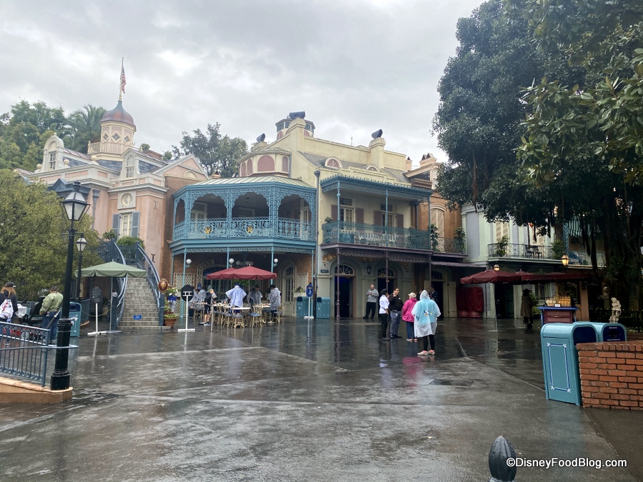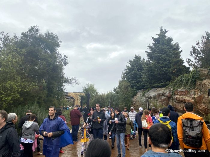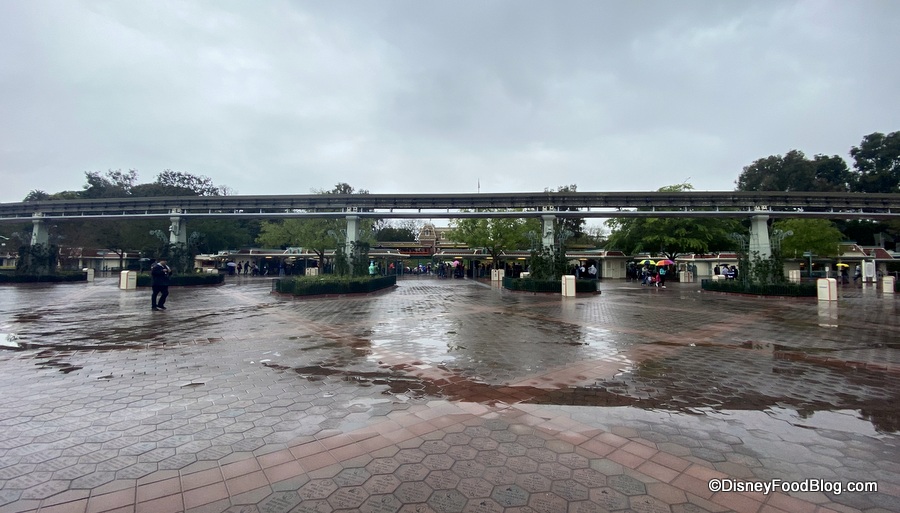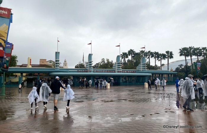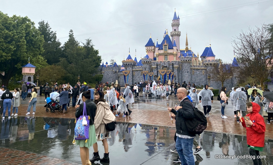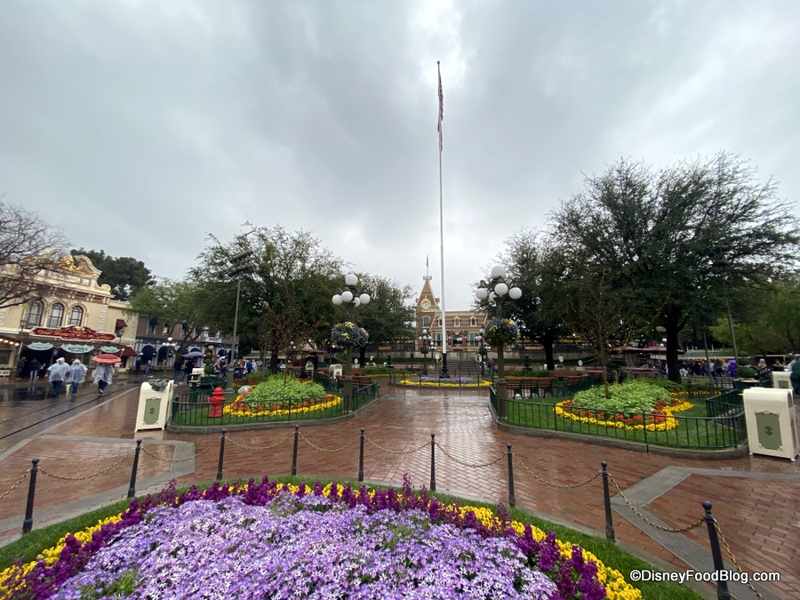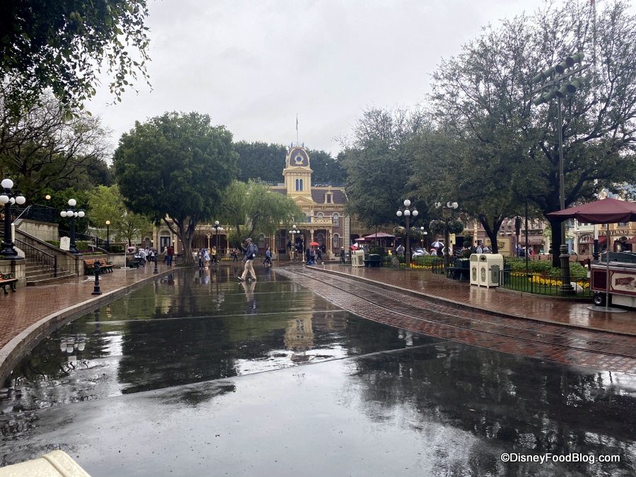 It’s raining today. And inclement weather can affect crowd levels at any given time. But we’re nevertheless sharing our look around Disneyland park, where guests are still lining up a bit for those classic Disneyland Corn Dogs at the Little Red Wagon…