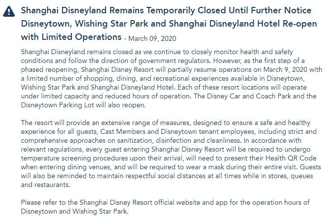 March 9, 2020 – Disney announces and REOPENS on the same day Disneytown, Wishing Star Park, and Shanghai Disneyland Hotel with limited capacity and reduced hours of operation. THIS IS 44 DAYS AFTER THE CLOSURE OF SHANGHAI DISNEYLAND. All guests entering the area would need to undergo temperature screenings and are required to wear masks during their entire visit. (source) Shanghai Disneyland Park remains closed as of this writing.