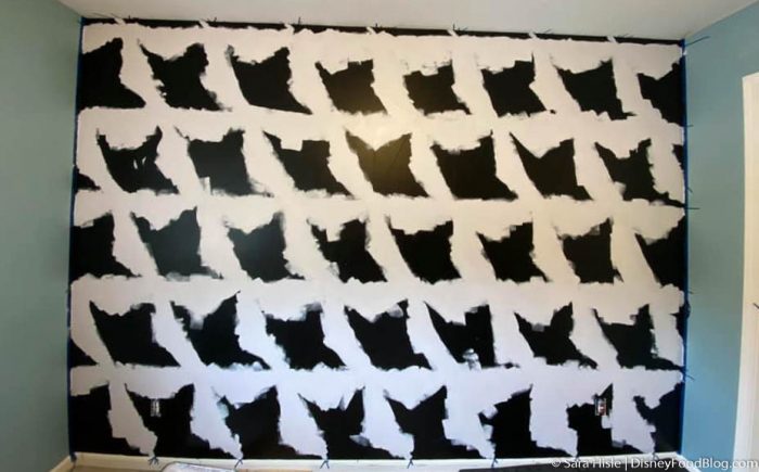 To make your very own Epcot wall, you’re going to need some paint. Sara used these greys from Behr.com in Elemental Gray, Dutch White, and Graphic Charcoal plus a plain Black! You can order these guys by the gallon online. This project took about half a gallon of each of the greys and 3/4 of a gallon of black paint.