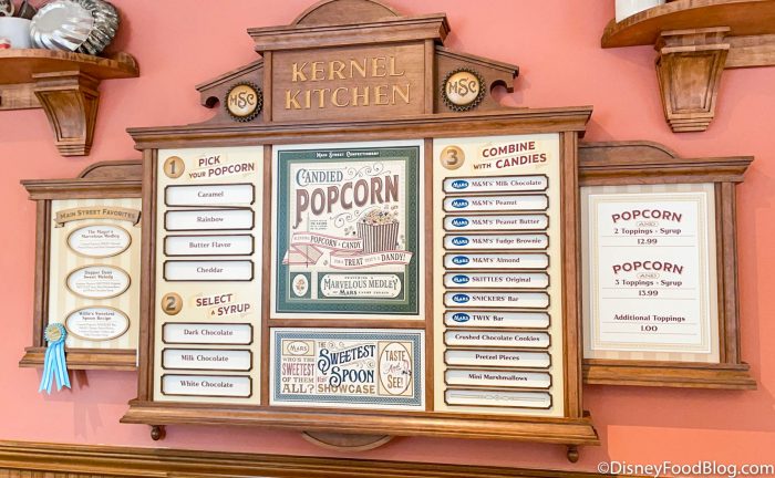 Main Street Confectionery has a completely new look now since it was remodeled! And, with that new look came a NEW popcorn experience! You can make your own, custom popcorn over here. Pick between Caramel, rainbow, butter, or cheddar flavored popcorn (depending on availability), then pick a syrup of either dark, white, or milk chocolate. After that, you can mix in candies like M&Ms, marshmallows, skittles, snickers, and more!