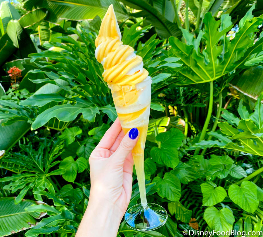 The first snack we recommend you try instead of your traditional Dole Whip is a specialty Dole Whip Float! One of our faves has got to be the Tropical Serenade from Aloha Isle. This treat is made with the famous POG juice (passion fruit, orange, and guava juice) swirled with coconut soft serve, and then topped with a pineapple upside-down cake pop. It is DELISH! And, it’s only available in Magic Kingdom.