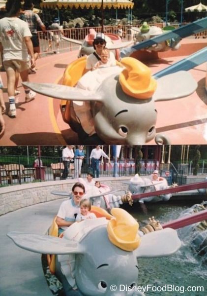 One staff member found a duo of Dumbo photos, taken one year apart at both Disney World AND Disneyland (and no, the coordinating yellow Dumbo was NOT planned)! Can you tell which Dumbo is from which park?