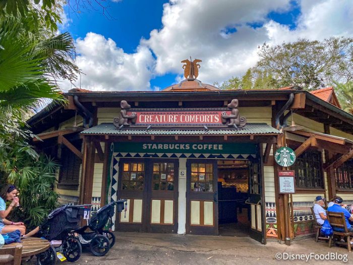 Creature Comforts is the cleverly disguised Starbucks at Animal Kingdom. Get your frappes and favorite Starbs specialty drinks along with a Colossal Mickey Cinnamon Bun!