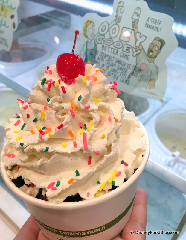 We truly could write a post about nothing but cups of cheese and be pretty pleased with ourselves, but we understand some of you guys have OTHER taste cravings to satisfy at Disney World. That’s why we want to tell you about this little hack — you can take any dessert at Magic Kingdom’s Plaza Ice Cream Parlor truly over-the-top for only 69 cents!
