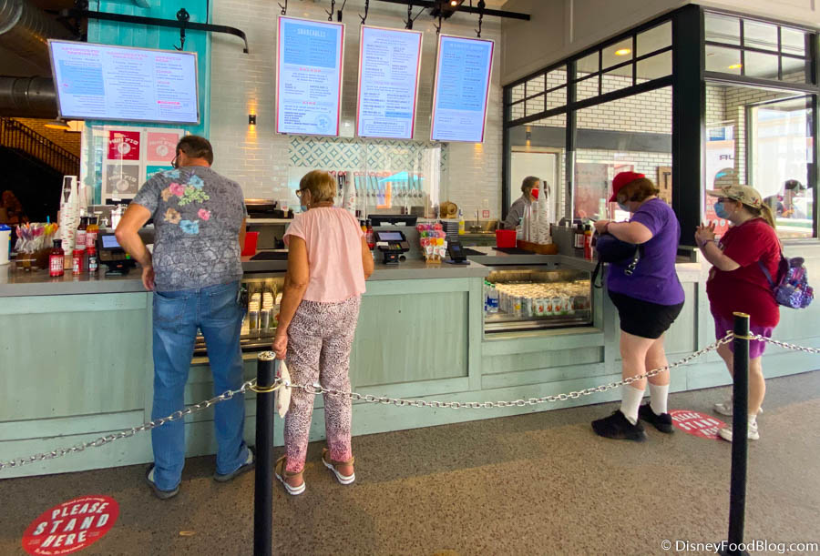 Like Blaze Pizza, Earl of Sandwich is an assembly line style spot. The difference is that Earl of Sandwich has cases that help to keep guests distanced from the glass. Of course, there were distancing stickers too.