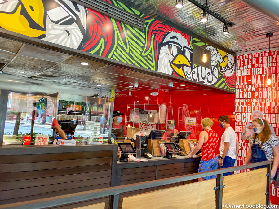 Chicken Guy! was pretty popular when it opened this morning. Still, physical distancing helps to make lines look a little bit longer and it went down pretty quickly. The distancing stickers here featured chicken feet telling us where to stand.