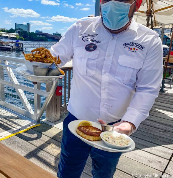 The servers at The Boathouse were all wearing masks and gloves. Cutlery was rolled in a cloth napkin while drinks were served in normal glassware with paper straws. We ordered the Jumbo Lump Cake with a side of Truffle Fries.
