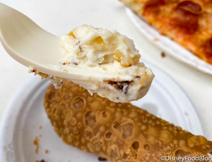 For us, we definitely prefer this type of pizza over Disney World’s standard quick-service pizza which is thicker and doughier. The cheese-to-bread-to sauce ratio is much better, plus Pizza Ponte’s slice packs a ton of flavor. The oils from the pepperoni really send this one over the top for us. Glancing at our watches, we just realized it must be Cannoli o’clock because it’s time for dessert!