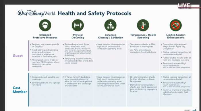 Disney has broken up their Health and Safety Protocols into five different priorities: Enhanced Protective Measures, Physical Distancing, Enhanced Cleaning/Sanitation, Temperature/Health Screening, and Limited-Contact Enhancements.