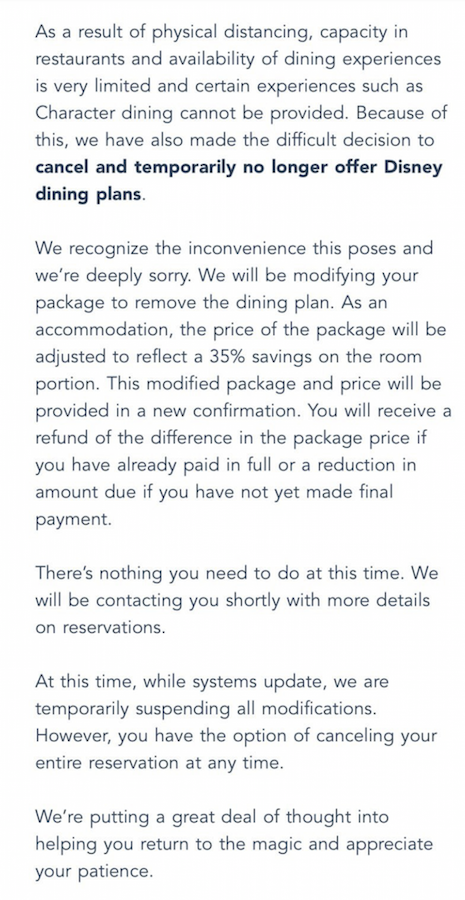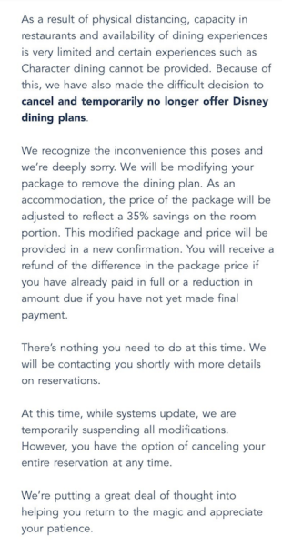 Thanks to our reader, @ashleyrakow , we have access to one of these emails. The message states, “As a result of physical distancing, capacity in restaurants and availability of dining experiences is very limited and certain experiences such as Character dining cannot be provided.”
