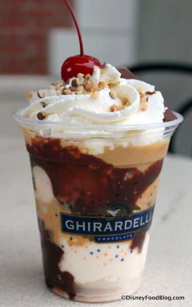 Instead of peanut butter as the toppings star, this one serves up oodles of caramel sauce over vanilla ice cream with sea salt, diced almonds, and whipped cream. It’s topped with a White Chocolate Caramel Ghirardelli Square.
