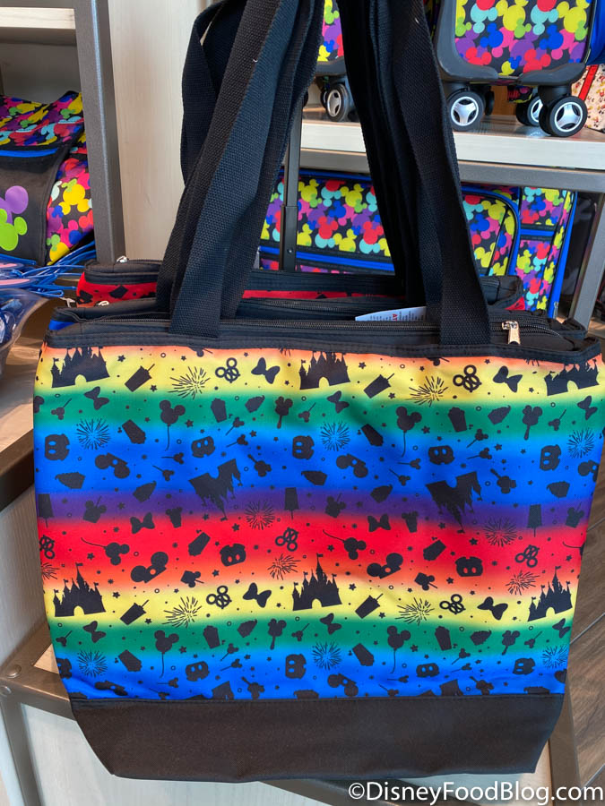 If you’re still thirsty for color like us, check out this super pretty Disney Parks Rainbow Tote Bag we saw in Disney Springs. This design has many of the same icons as the backpack.