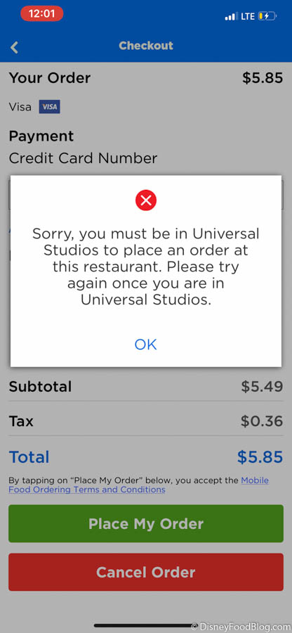 Universal is encouraging Mobile Ordering for dining. You do have to be inside the park for Mobile Order to work.