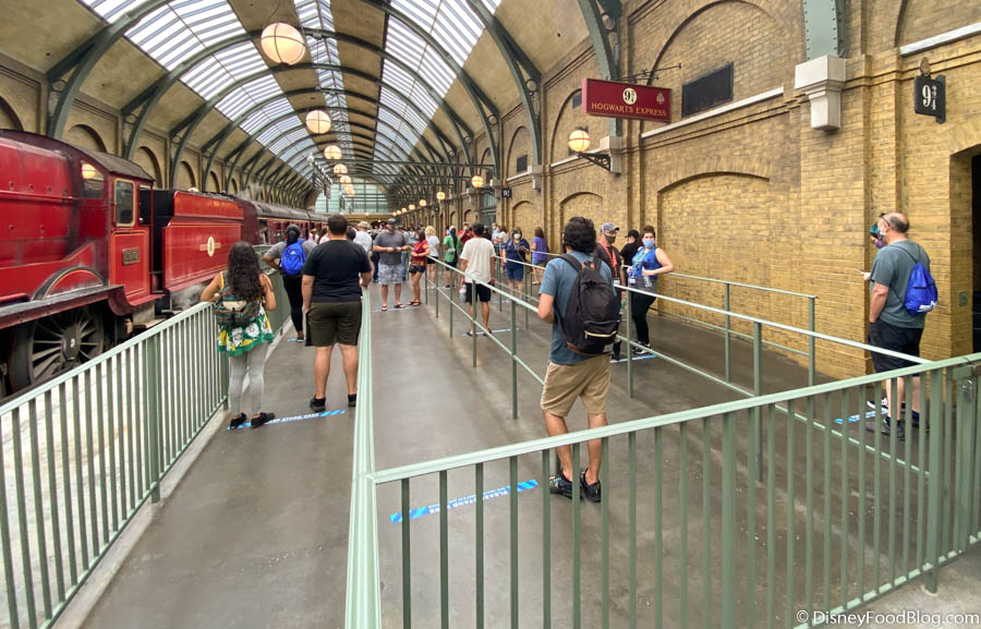 The Hogwarts Express also features a marked line to help guests with distancing. Team members are seating only one party per cabin on the train.