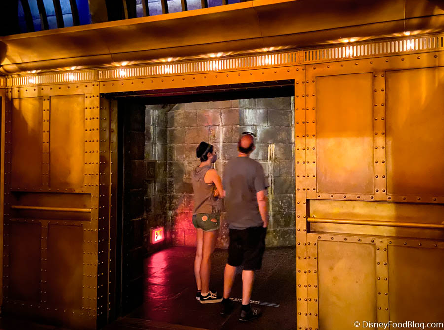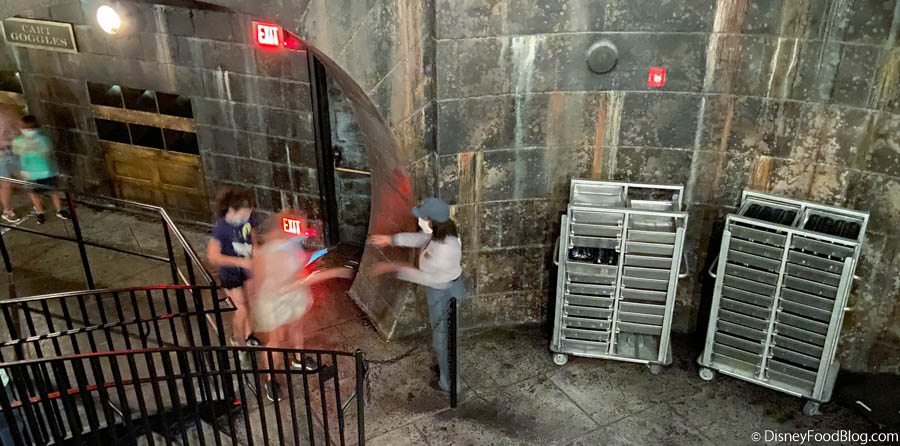 Escape from Gringotts typically has you grabbing 3-D goggles from bins. Today, the bins were empty and a team member was designated to individually hand out the goggles. Tip! It was much more comfortable to wear our goggles over our masks to keep them from fogging.