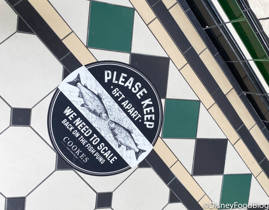 Social distancing markers have been added to the sidewalk out front just in case a school of fried fish-lovers happens to show up all at once!