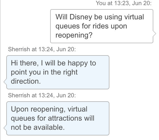 We reached out to a Disney Cast Member and were able to confirm that virtual queues will not be used for attractions upon reopening.