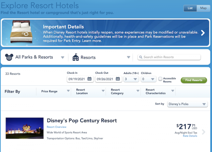 Guests can currently book a new Disney World vacation (including tickets and your hotel room) from January 1, 2021 – September 27, 2021. Of course, more dates should become available over time and we will update you when they do!