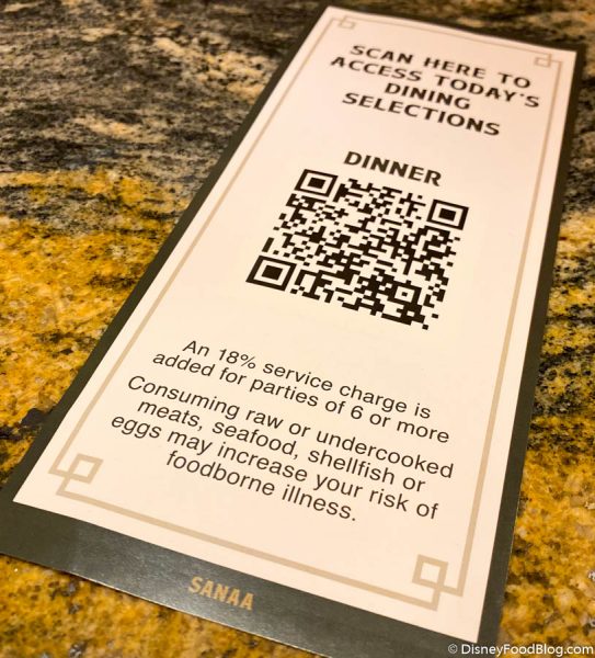 As we’ve seen a bunch around the reopened Disney World restaurants, Sanaa has leaflets on the table for access to a QR code menu. This code will take you right to the online listing for the menu on the Disney website.