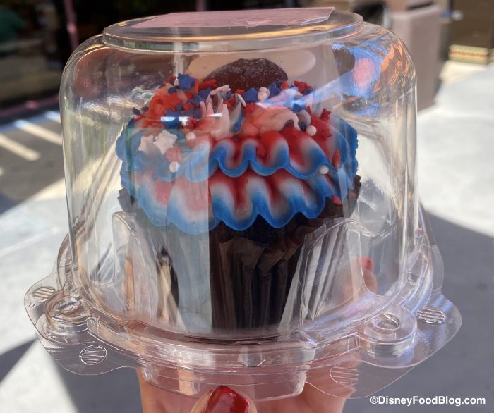 In fact, there are several ways to celebrate the Fourth of July, Disney-style! You can catch a virtual viewing of the Magic Kingdom fireworks show, find great deals at Disney Springs, and enjoy some patriotic treats! Speaking of star-spangled snacks, we spotted a gorgeous Fourth of July cupcake at Capt. Cook’s in Disney’s Polynesian Village Resort that we just had to try!