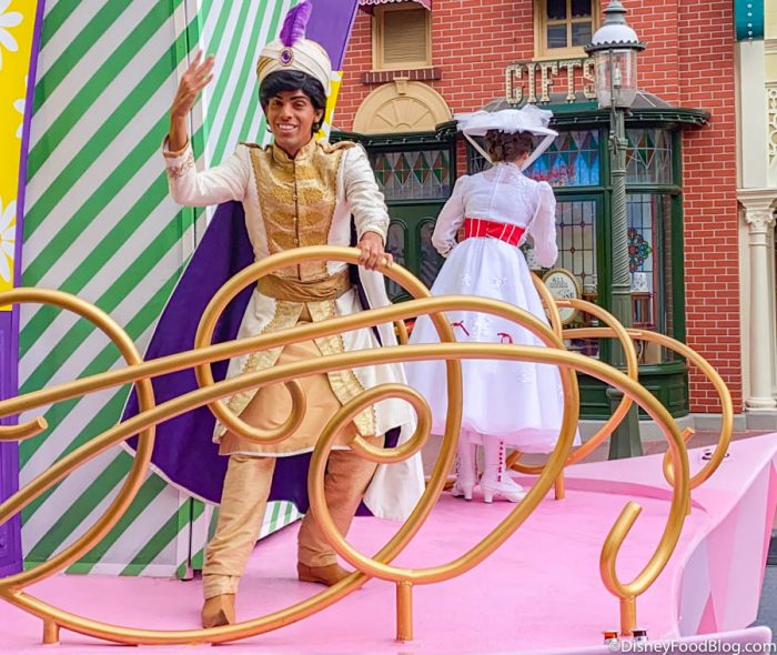 To us, many of these new Character Cavalcades felt like mini-impromptu parades! Yup — they actually LOOKED and FELT like tiny parades and were happening through the park — even if they were just baby versions of the real thing! There was plenty of pageantry, music, and TONS of Disney characters to watch go by! The mixture of characters on the Fantasyland Cavalcade was an interesting mix up — Alice, Peter Pan, Pooh Bear, Alladin, and Mary Poppins! Wow!