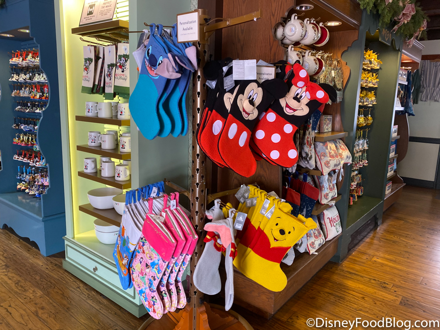 Earlier, we spotted a ton of new stockings and Christmas merch in Disney Springs. But recently, we stopped into Ye Old Christmas Shoppe to see if they added anything new. On our way in we spotted something spooky. A brand new Haunted Mansion stocking!