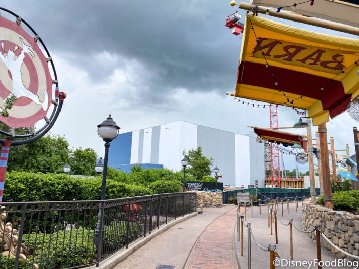 We stopped by Storybook Circus to get a better view of TRON Lightcycle Run! To our eyes, the massive show building hasn’t appeared to change very much since the last time we swung by!