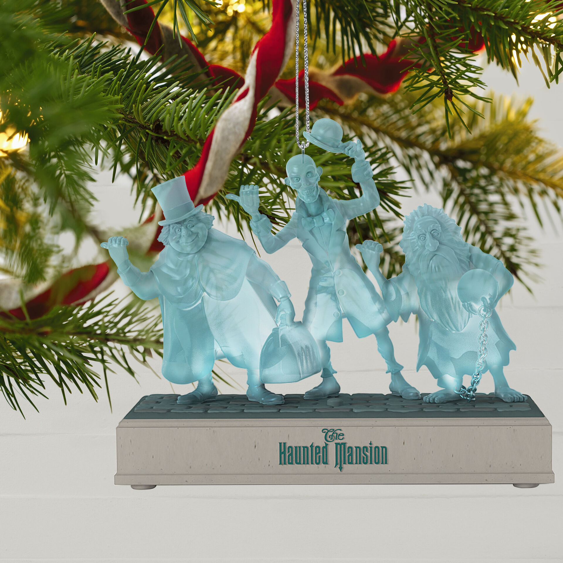 If this ornament senses your sympathetic vibrations as you press the button in the center, then it will truly begin to materialize! Our hitchhiking ghosts become colorfully illuminated, and that classic Haunted Mansion theme song will fill your ears!