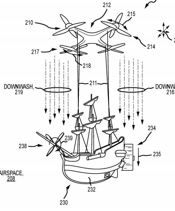 Take this figure from the patent for instance. Illustrated here is a potential use where the drone is used to suspend a “magical ship” (certainly looks like a flying pirate ship a la Peter Pan to us!). The drone flies the ship around and the air produced from the propellers shoots down to move the decorative rotors on the ship itself. It could also help to make sails billow in the wind!