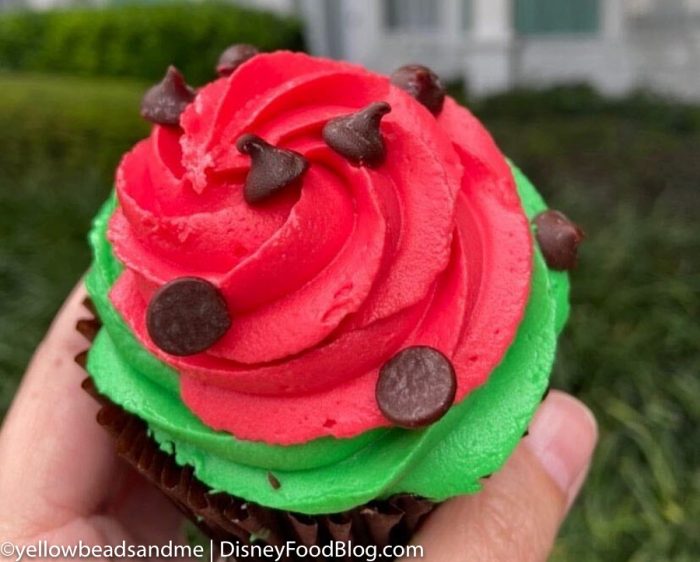 The new watermelon cupcake reminds us of the watermelon cupcake we spotted at Disney’s Pop Century Resort back in 2018. This cupcake also beckons us with bright colors and a rich chocolate cake! The cupcake is piled high with red and green icing and topped with chunky chocolate chips. You can make the cupcake your own for $5.99.
