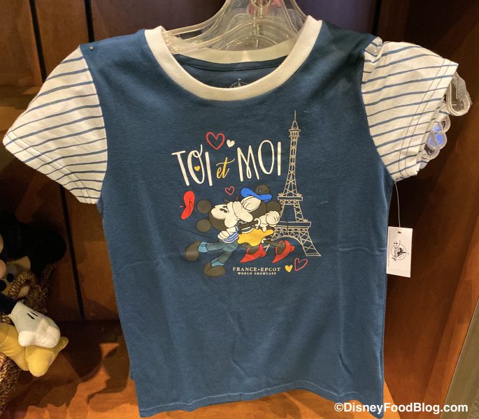 Mickey and Minnie are sharing a romantic kiss near the Eiffel Tower on this “Toi et Moi” Shirt, priced at $29.99.