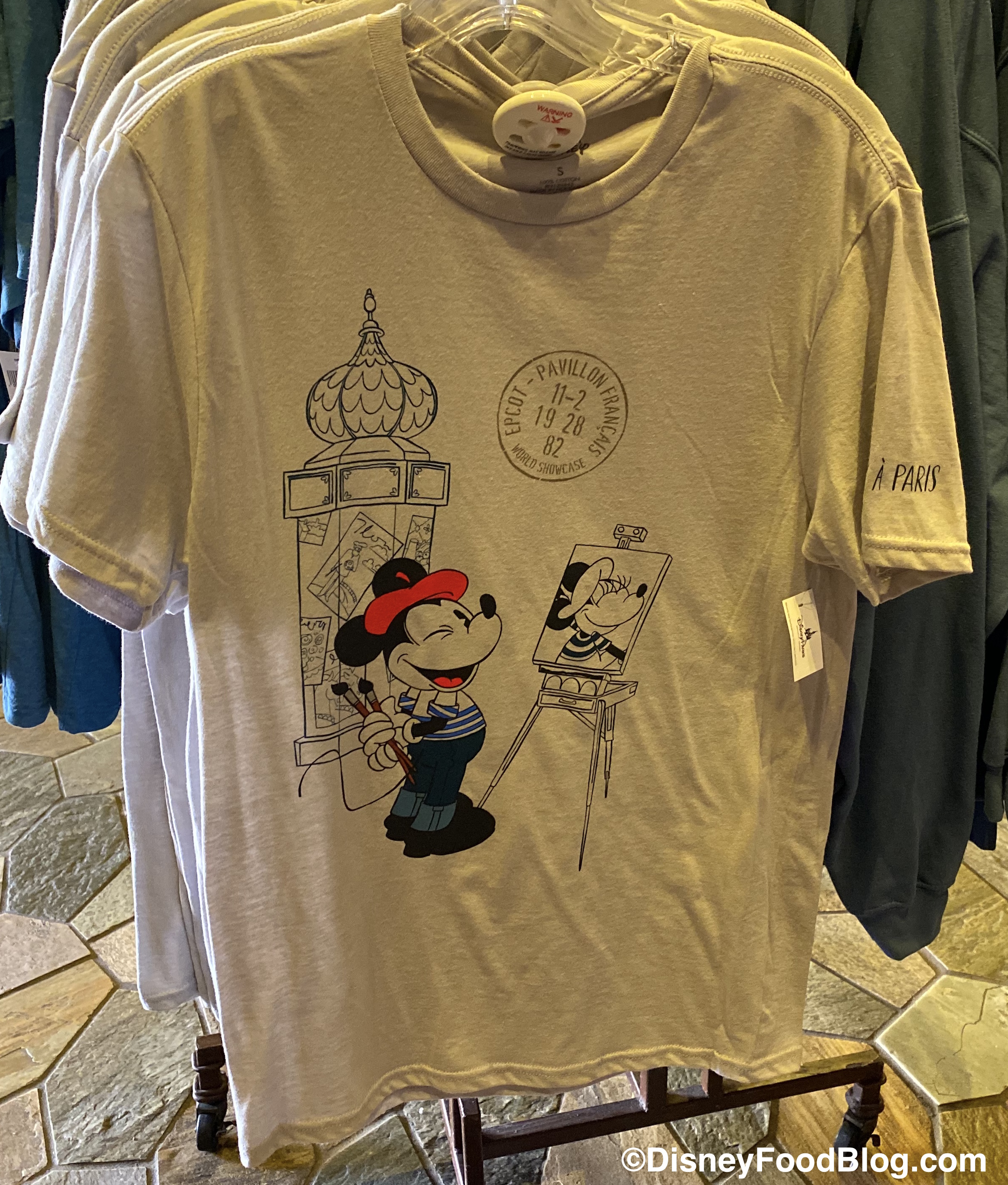 We LOVE the beret the main mouse is rocking in this Mickey Bonjour Shirt, priced at $29.99!