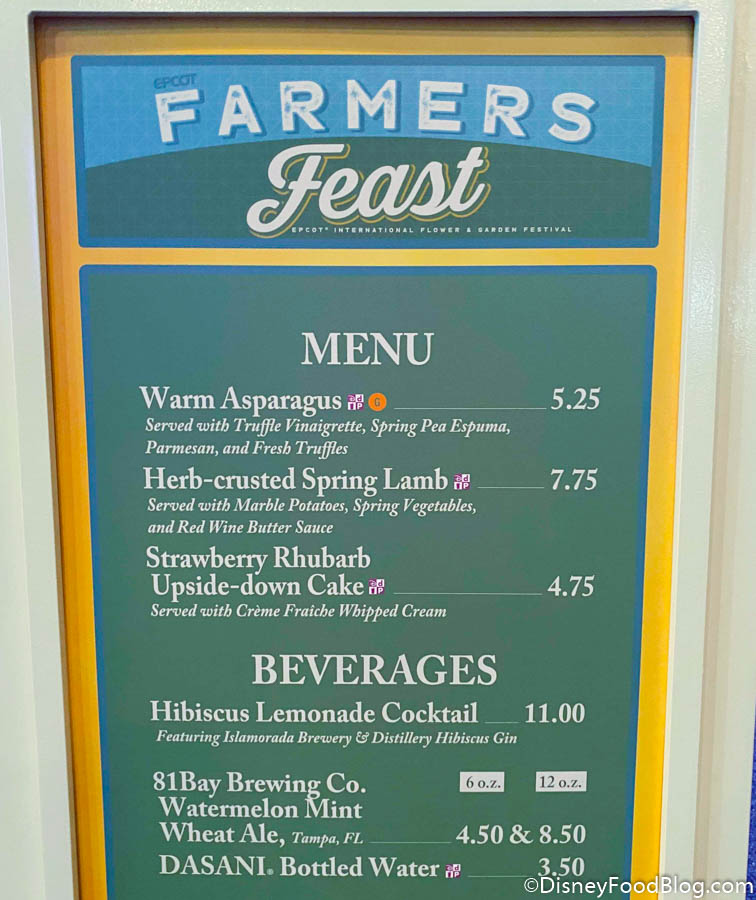 For instance, many of the EPCOT Festival Booth menus still have Disney Dining Plan logos. We originally noticed them during the Taste of EPCOT International Food & Wine Festival last fall and we’ve since seen them on menus at the Taste of EPCOT International Festival of the Holidays, the Taste of EPCOT International Festival of the Arts, and the Taste of EPCOT International Flower & Garden Festival.