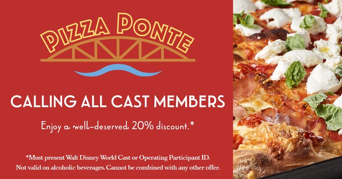 Now, Walt Disney World Cast Members can get a special 20% DISCOUNT at Pizza Ponte! To take advantage of this deal, Cast Members must present their Walt Disney World Cast or Operating Participant ID.