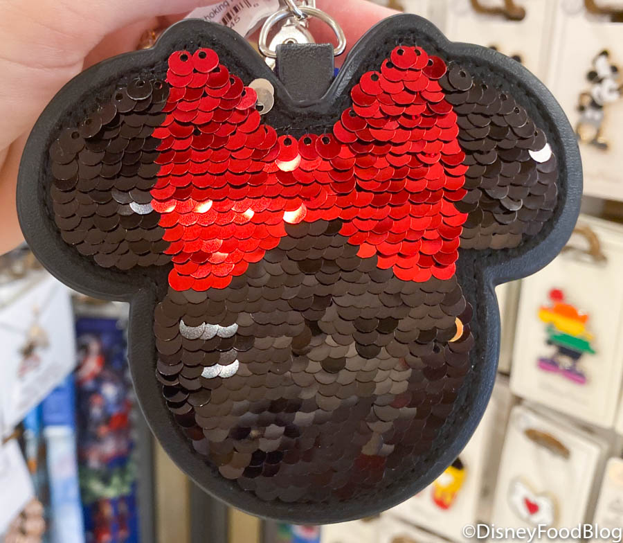 And here’s the Minnie reverse sequin keychain which looks almost exactly like the Mickey keychain — minus the big red bow on her head!