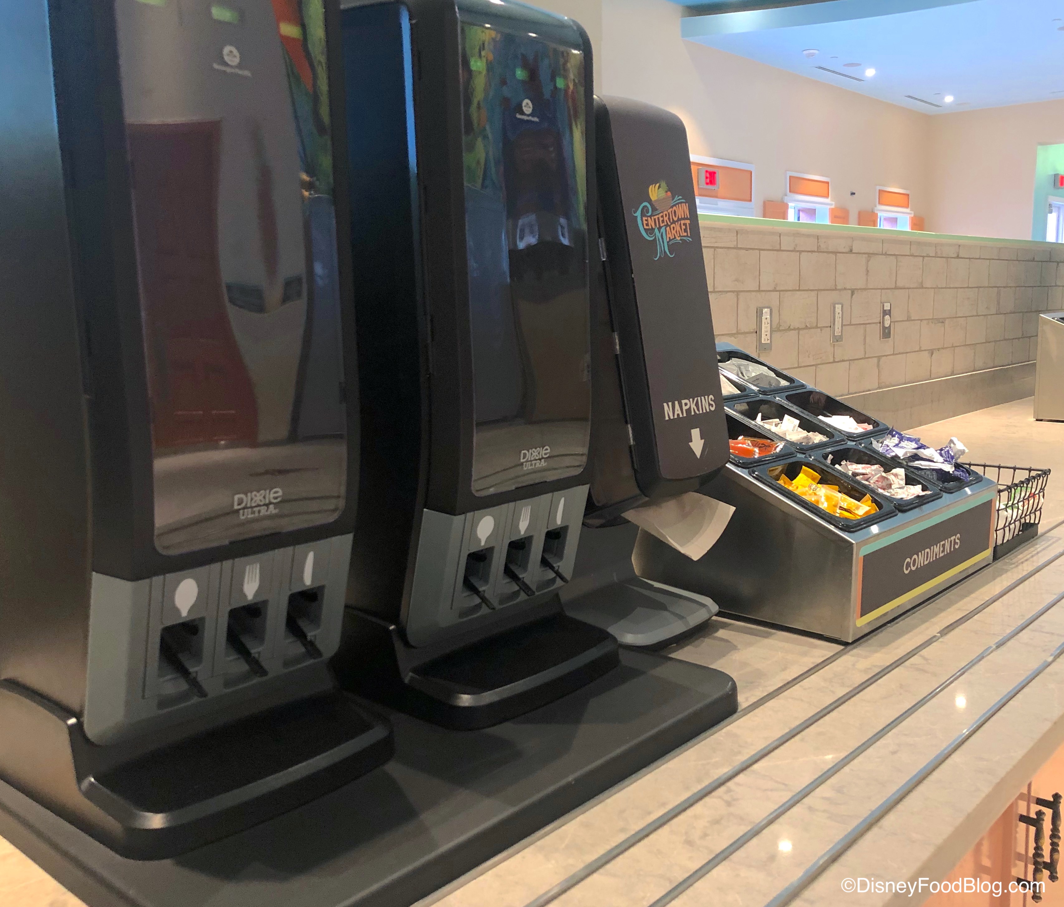 Condiments were self-serve here, as were napkins and utensils. We were pleased to see those single-serve utensil dispensers like what we’ve been seeing at the 2020 Taste of Epcot International Food and Wine Festival!