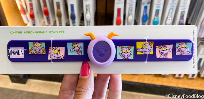 Slap bracelet MagicBands seem to be having a comeback right now. We’ve seen these alternative MagicBands come and go since they first debuted last winter, but the Figment Slap MagicBand has reappeared at Disney’s Hollywood Studios for $24.99!