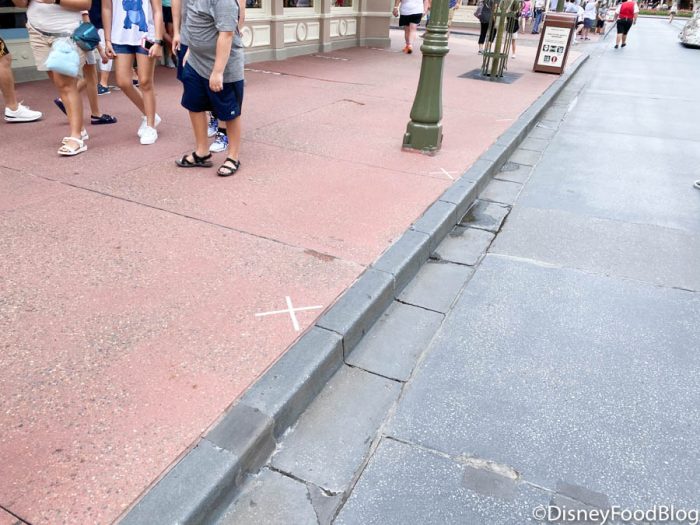 Once we got inside the park, we noticed more social distancing tape had been added to one side of Main Street, U.S.A.! There are now “X” markers indicating where guests should stand to watch the Character Cavalcades at safe distances from each other!