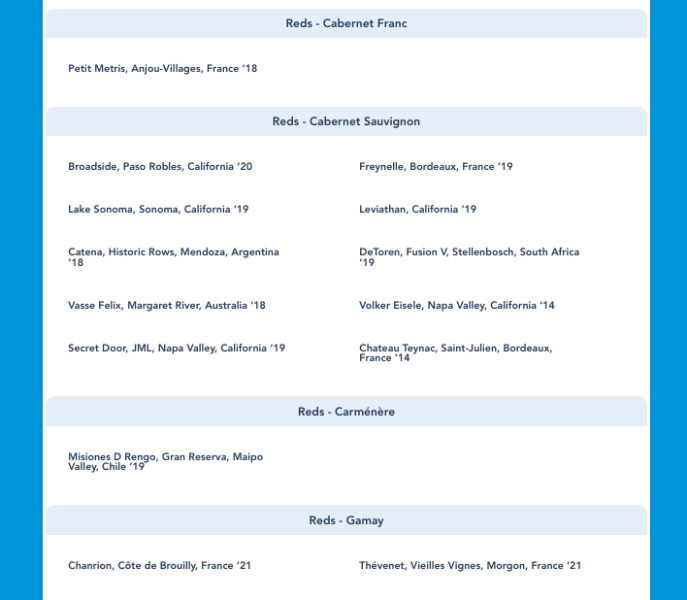 Then it moves into red wines by the glass, including lots of different sections for different kinds of red wine.