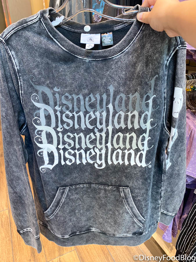 But don’t fly away in your coffin-shaped sleigh just yet! There’s also a new Disneyland hoodie for $44.99! The front features the same spooky font, although this time the graphic is repeated and the background is very distressed!