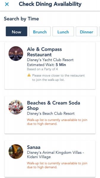 We noticed that Ale & Compass Restaurant showed an estimated wait time of 5 minutes based on a party of 4. (It also requested that we “move closer to the restaurant” to join the walk-up list.) As a reminder, some restaurants may have walk-up availability even if they do not have the mobile capability, as noted on the app. Guests are always welcome to check with a Cast Member.